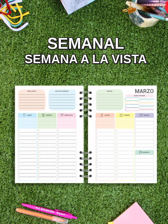 La versión SEMANAL O SEMANA A LA VISTA es perfecta para quienes necesitan una organización sencilla y a simple vista, ya que se ve toda la semana en dos carillas enfrentadas. Con un montón de anexos, como planillas de gastos y hojas de notas, este diseño te va a permitir tener un tus días organizados en una forma funcional y cómoda de llevar a todos lados.